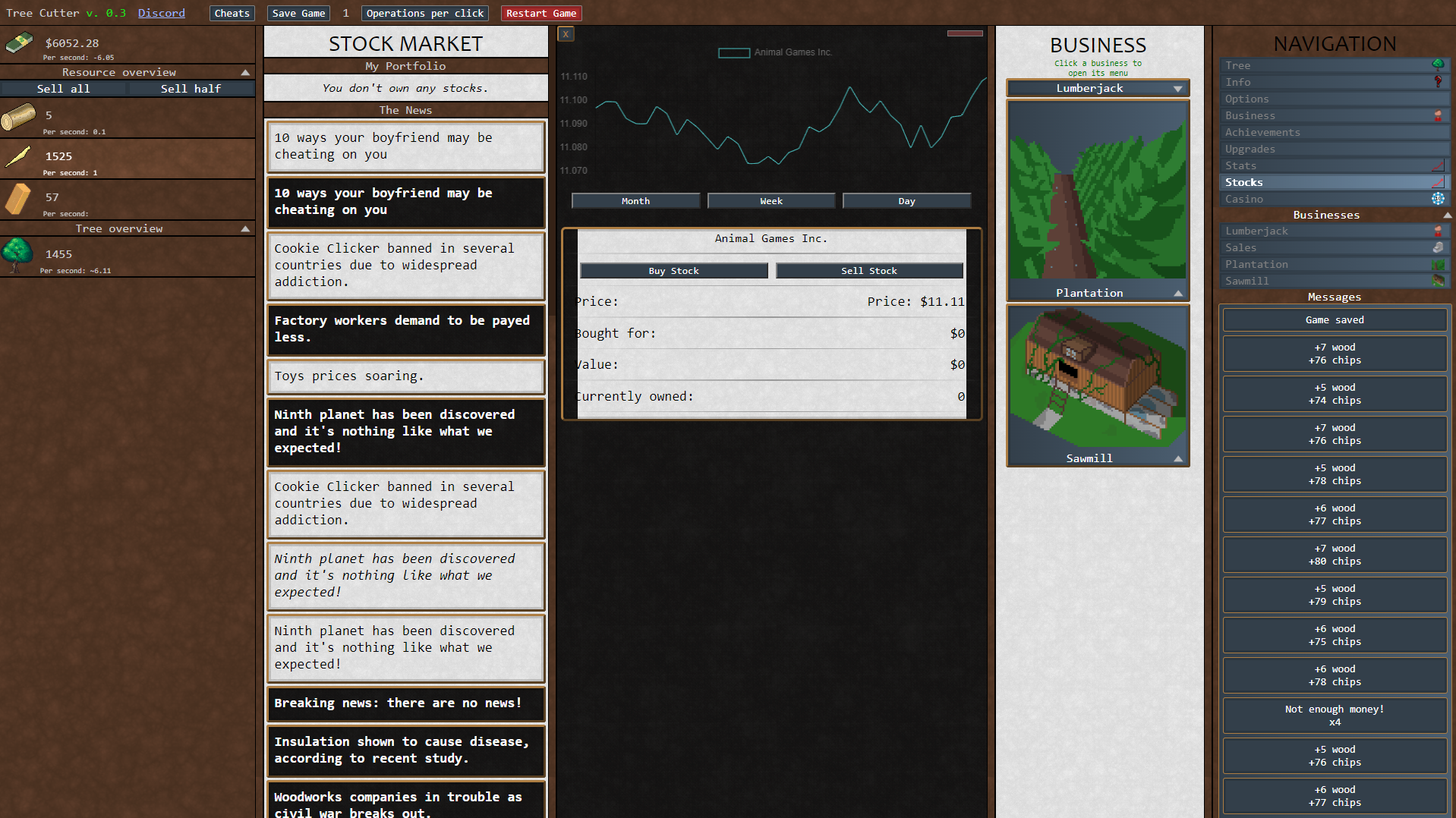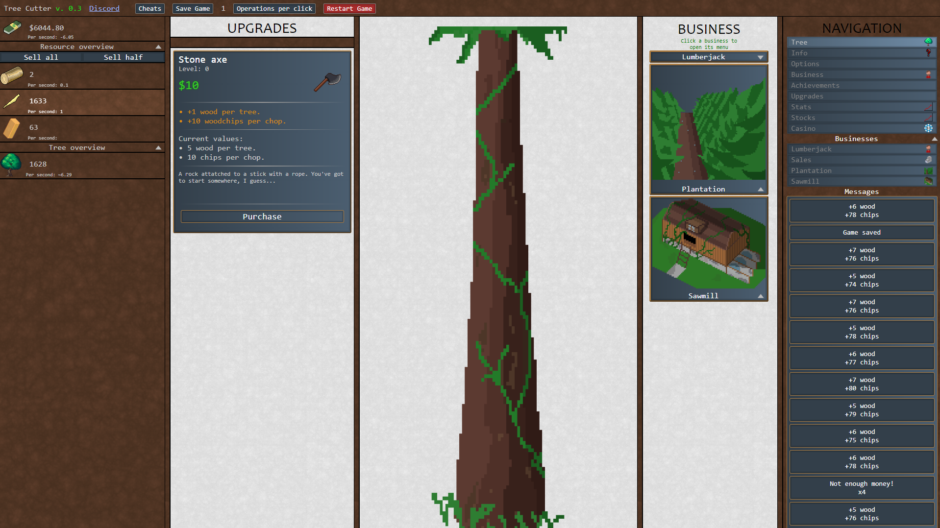 Tree Cutter is my very first project, what got me started on this journey. The game is an incremental, inspired by Cookie Clicker. The object is simply to cut the tree, get wood, and sell that wood for cash.